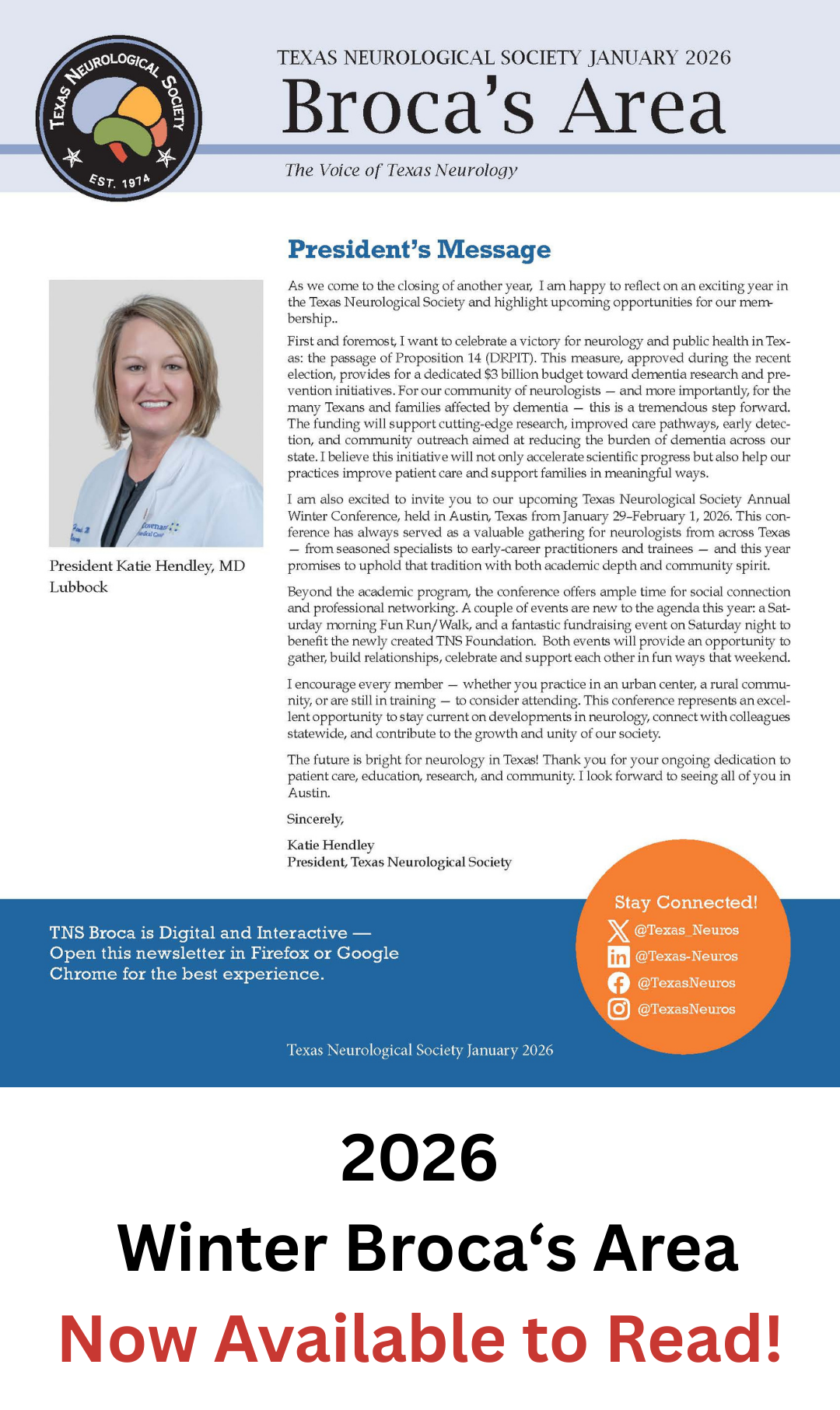 Registration Now Open!![]() Registration is now open for the TNS 2026 Winter Conference! Join neurologists from across Texas as we get together for a weekend of networking and education to stay at the forefront of neurology. You won't want to miss out on the multitude of fun opportunities we have planned like our 1st Annual Fun Run and our very special, and hilarious, guest Dr. Glaucomflecken!